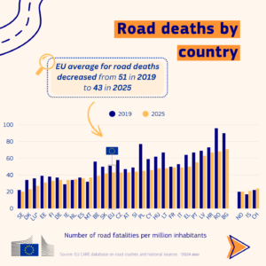 Postępy w zakresie bezpieczeństwa ruchu drogowego różnią się znacznie w zależności od kraju. W latach 2024–2025 odnotowano znaczny spadek w Estonii (-38%) i Grecji (-22%). Na podstawie tych wstępnych, a czasem częściowych danych Belgia, Bułgaria, Dania, Polska i Rumunia są obecnie na dobrej drodze do osiągnięcia celu ograniczenia liczby śmiertelnych ofiar wypadków drogowych o 50 % do 2030 r.